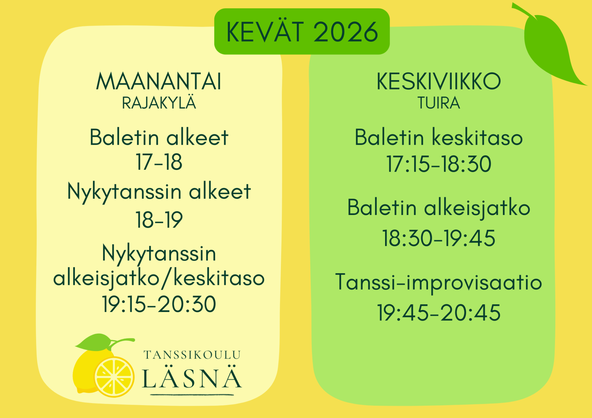 Tutustu tarkemmin kurssikuvauksiin alta ja ilmoittaudu ilmoittautumislomakkeella tai sähköpostitse osoitteeseen tuija@tanssikoululasna.fi. Jos haluat kauden alusta mukaan, ilmoittaudu viimeistään to 16.1.2026. Voit ilmoittautua kursseille myös kesken kauden!