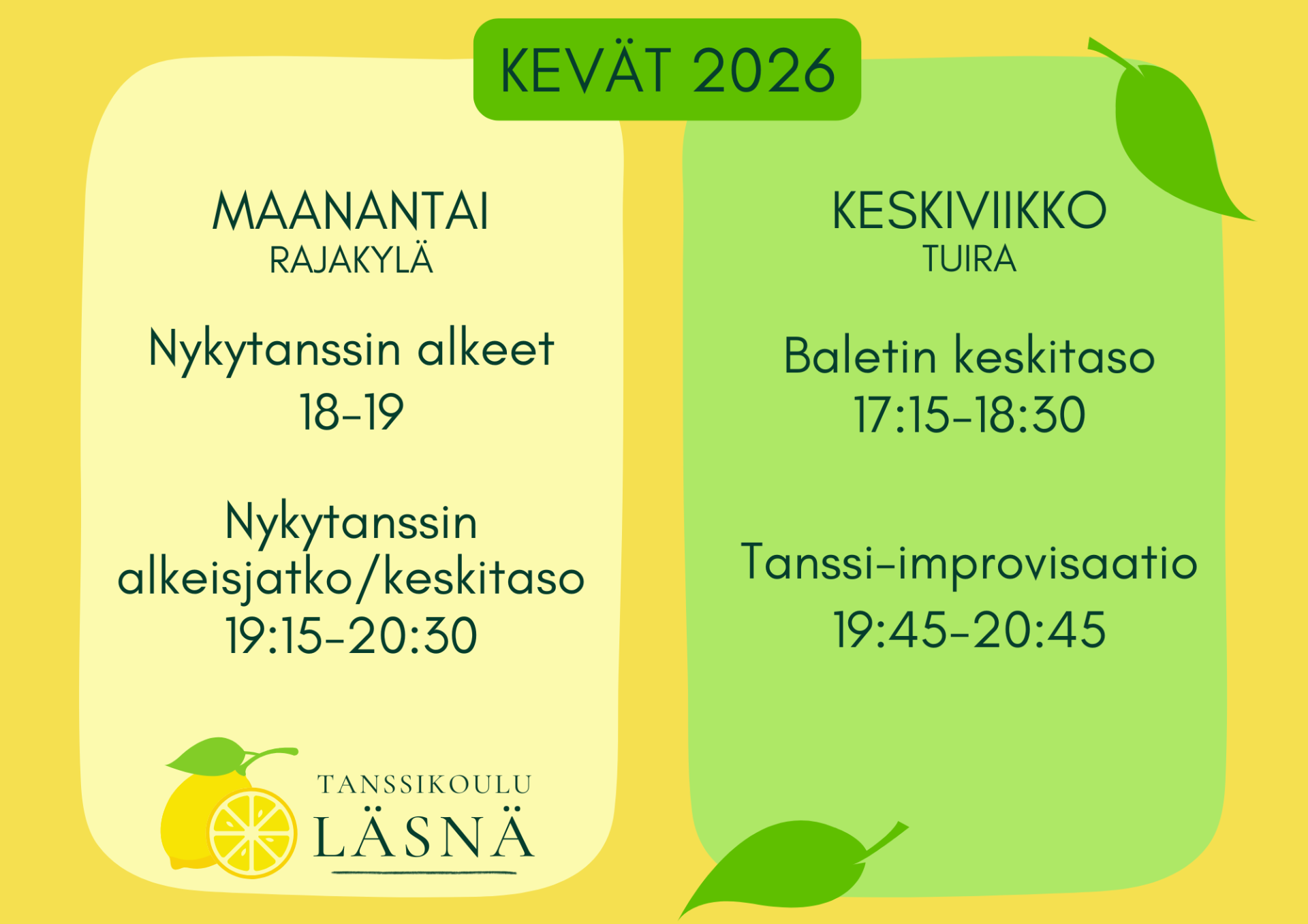 Tutustu tarkemmin kurssikuvauksiin alta ja ilmoittaudu ilmoittautumislomakkeella tai sähköpostitse osoitteeseen tuija@tanssikoululasna.fi. Jos haluat kauden alusta mukaan, ilmoittaudu viimeistään to 15.1.2026. Voit ilmoittautua kursseille myös kesken kauden!